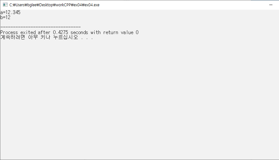 그결과 12.345의 실수 값이 12의 정수값으로 변환되어 b에 대입된것을 확인할 수 있습니다.